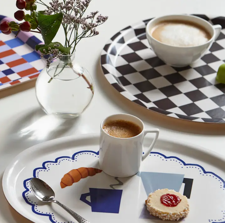 This cream-colored tray features a charming pattern featuring a coffee cup, a pot and a croissant surrounded by a blue lace border, adding a touch of nostalgia to your serving ware. The pattern is made using hand-cut paper shapes giving the print an organic feel.