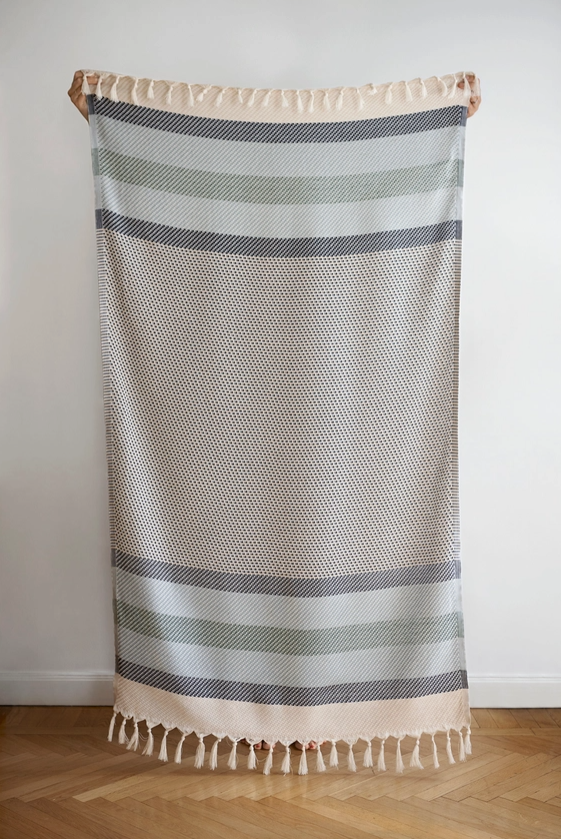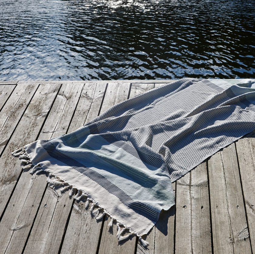 Designed in Stockholm by BLU KAT. Hand-loomed in Denizli, Turkey by artisan weavers on traditional wooden looms, finished with hand-tied tassels.